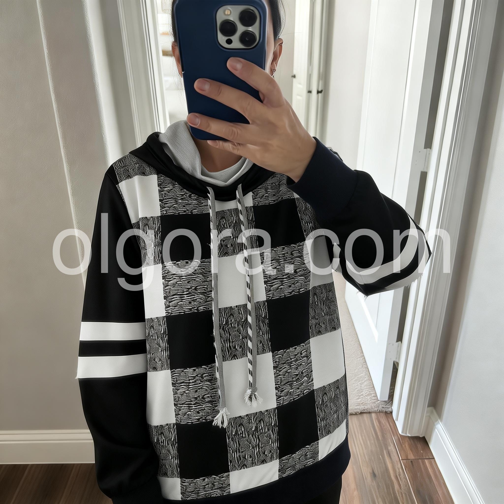 Keep it retro-classic with this black and white checkered hoodie! Repeating white and black blocks makes this comfortable hoodie a must-have for your casual days, along with two stripes on the black long-sleeves for a retro look. The drawstrings are made to match, giving this fashionable hoodie a non-stop black and white design.