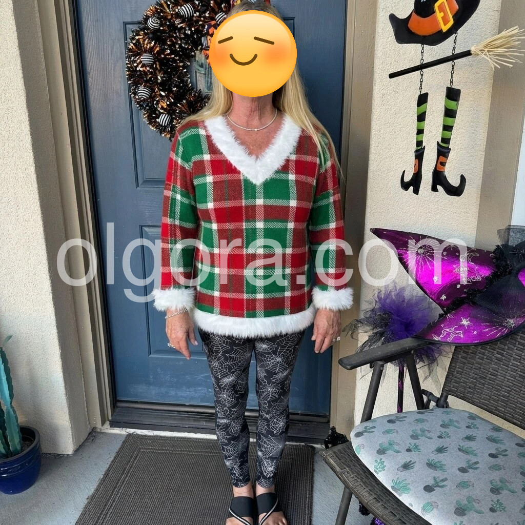 Festive Green Plaid Christmas Top with Faux Fur Trim