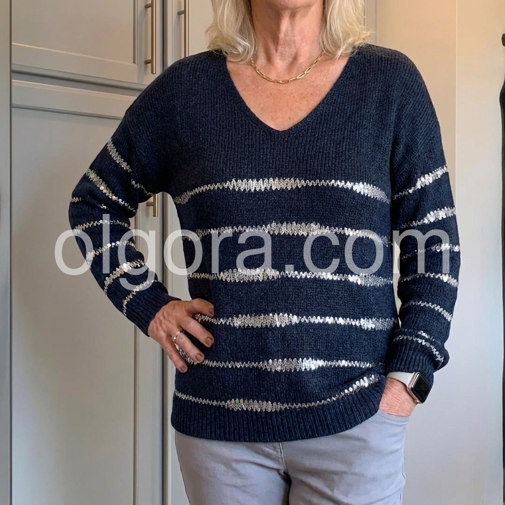 Yes!It runs true to the garment size chart please choose your size based on your measurements.Stay stylish and warm with our Groovy V-Neck Striped Print Navy Sweater. The v-neck adds a touch of elegance while the striped print adds a trendy flair. Made with high-quality materials, this sweater is perfect for any occasion. Upgrade your wardrobe and stay cozy this season.