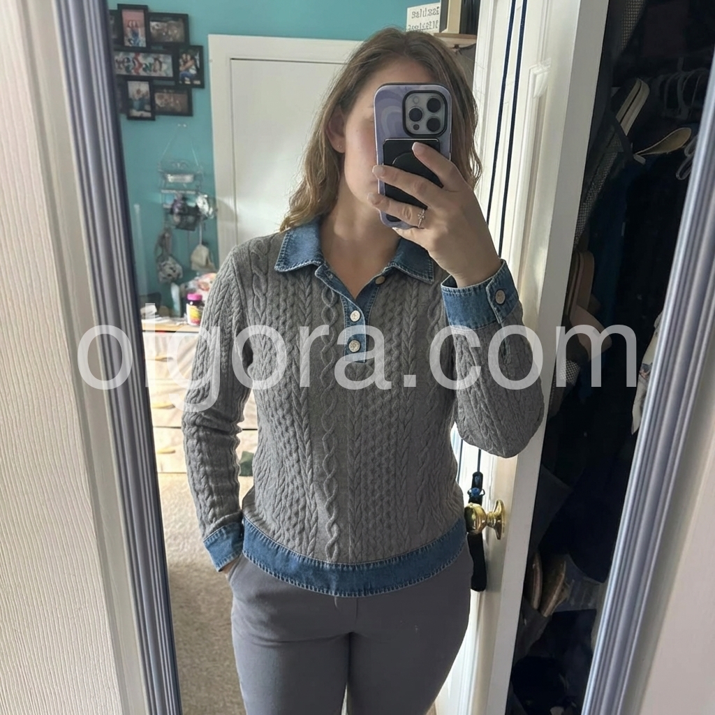 Yes!It runs true to the garment size chart please choose your size based on your measurements.Elevate your casual wardrobe with this sophisticated grey cable knit sweater, featuring a distinctive denim collar that bridges classic and contemporary style. The intricate cable pattern adds textural depth and visual interest, while the long sleeves provide warmth and versatility for layering. Crafted with attention to detail, this piece transitions seamlessly from weekend wear to smart-casual settings, offering the comfort of premium knitwear with refined aesthetic appeal.